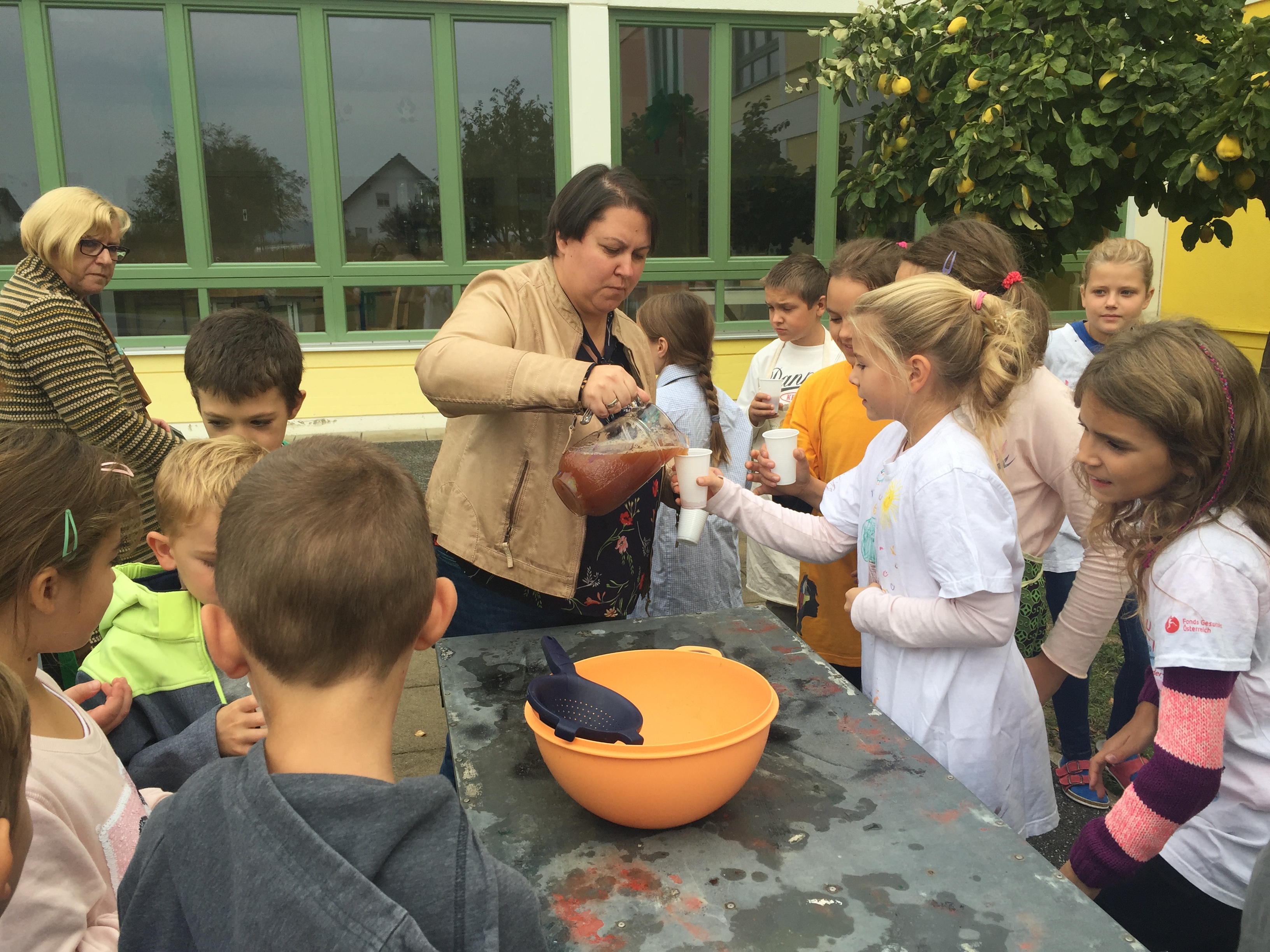 Gemeinsam pressten die Schülerinnen und Schüler Äpfel und produzierten leckeren Apfelsaft im Schulhof. Sie verarbeiteten auch süße Weintrauben in der Schulküche zu einem herrlichen Traubensaft.