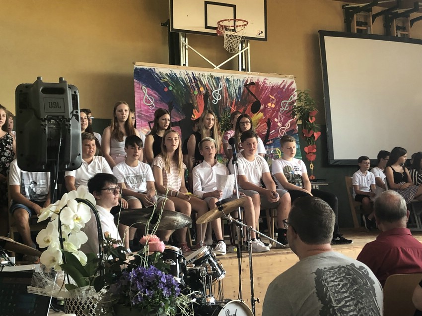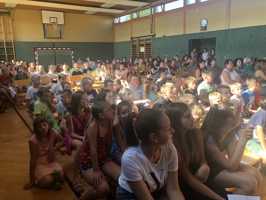 Die 4. Klassen verabschiedeten sich in der letzten Schulwoche mit einer überaus gelungenen Feier und großartigen Darbietungen. Die 4a hatte einen Film und die 4k eine PowerPoint-Show als Rückschau auf die vergangenen vier Jahre vorbereitet. Beide Klassen hatten dabei absolut eigenständig gearbeitet und zeigten nicht nur technisches Können, sondern auch viele persönliche Momente. Besonders die Verabschiedung von den beiden KVs – Daniel Siegl und Ilse Zsivkovits – war sehr emotional und auf beiden Seiten flossen die eine oder andere Träne. Doch auch alle anderen Lehrerinnen und Lehrer wurden mit persönlich verfassten Dankesworten verabschiedet. Dabei fanden die Schüler*innen sehr wertschätzende Worte für alle, die sie im Laufe von vier Jahren begleitet hatten.