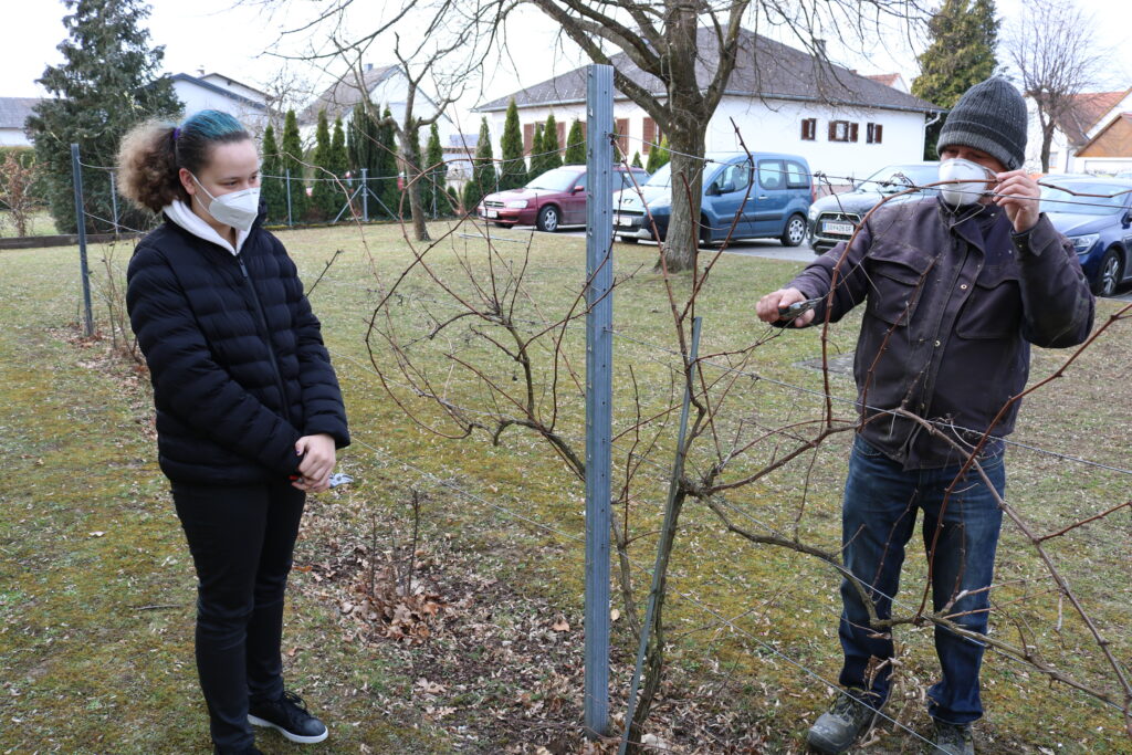 Am 23.3.2021 durften wir beim alljährlichen Baumschnitt der Schulobstbäume dabei sein. Ein ehrenamtlicher Mitarbeiter des Burgenländischen Naturschutzbundes erklärte uns, wie man Obstbäume richtig zurückschneidet. Wir lernten, dass der Winterschnitt das Wachstum der Bäume anregt und der Sommerschnitt gut für die Fruchtbildung ist. Die richtige Schnittstelle ist entscheidend für die Wachstumsrichtung der Äste. Damit kann man die Geometrie des Baumes bestimmen, sodass der Wasserhaushalt ausgewogen und der Baum durch gleichmäßig ausgeprägte Leitäste vor dem Auswurzeln geschützt ist. Ganz besonders die Mathematiklehrer*innen waren von dieser strukturierten Herangehensweise begeistert. Sehr spannend war auch, dass es uns erlaubt wurde, selbst mit zu helfen. Sogar die Weinreben durften wir nach einer kurzen Erklärung eigenhändig zurechtstutzen.