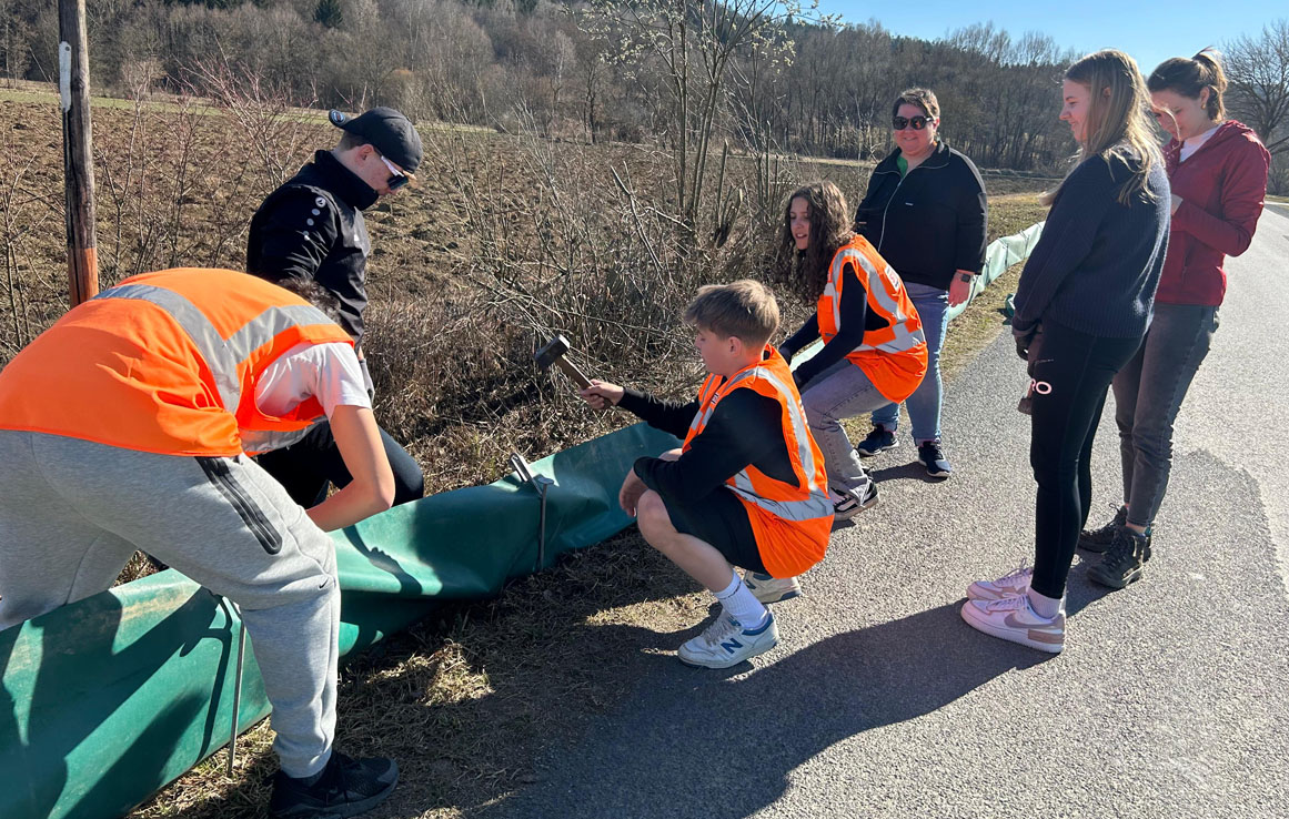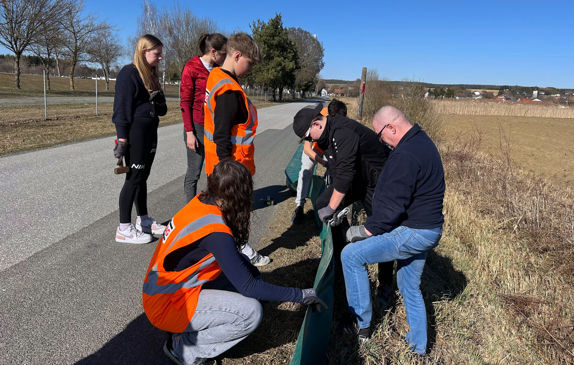 Mit viel Eifer arbeiteten die Schüler:innen am Zaun und sammelten entlang der Straße Müll, der von der Gemeinde Rauchwart entsorgt wurde. Der Zaun schützt Amphibien, die jährlich beim Überqueren der Straße in Gefahr geraten. Diese Maßnahme ist wichtig für den Erhalt der heimischen Tierwelt.