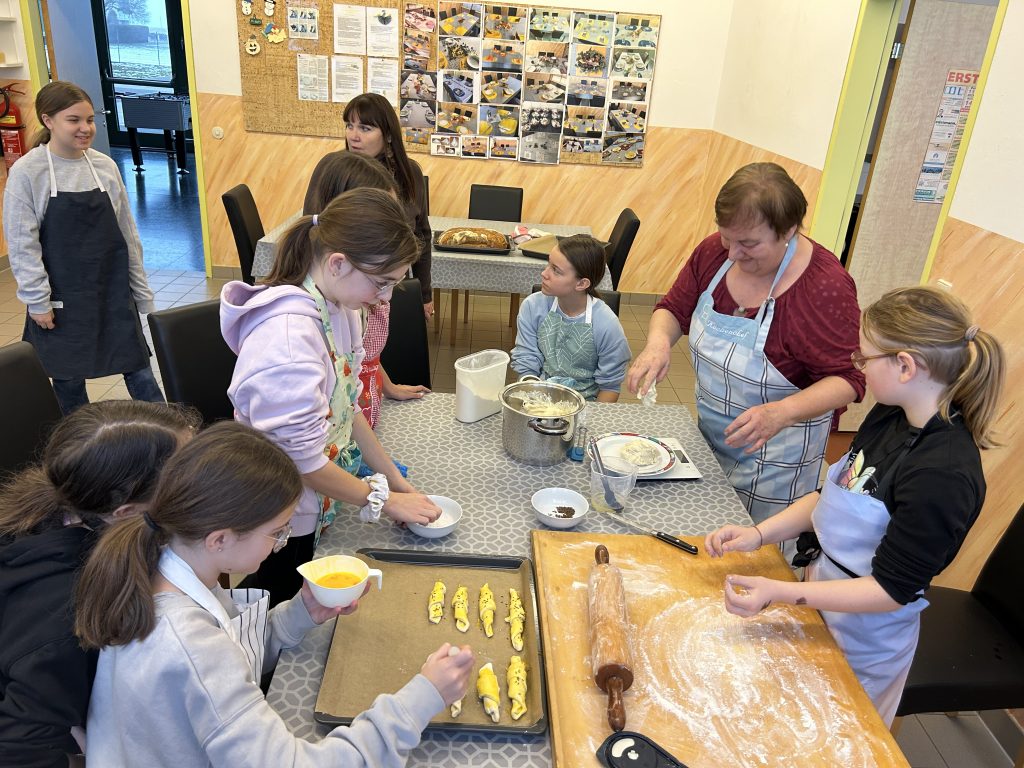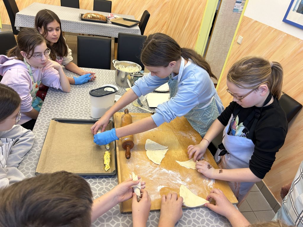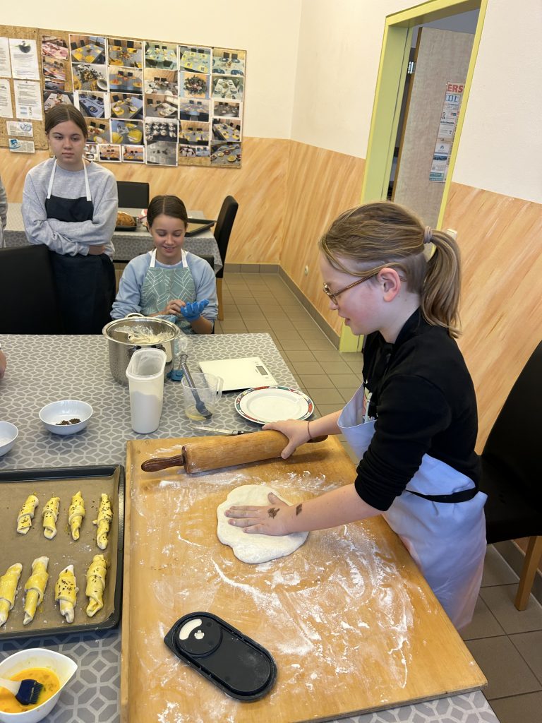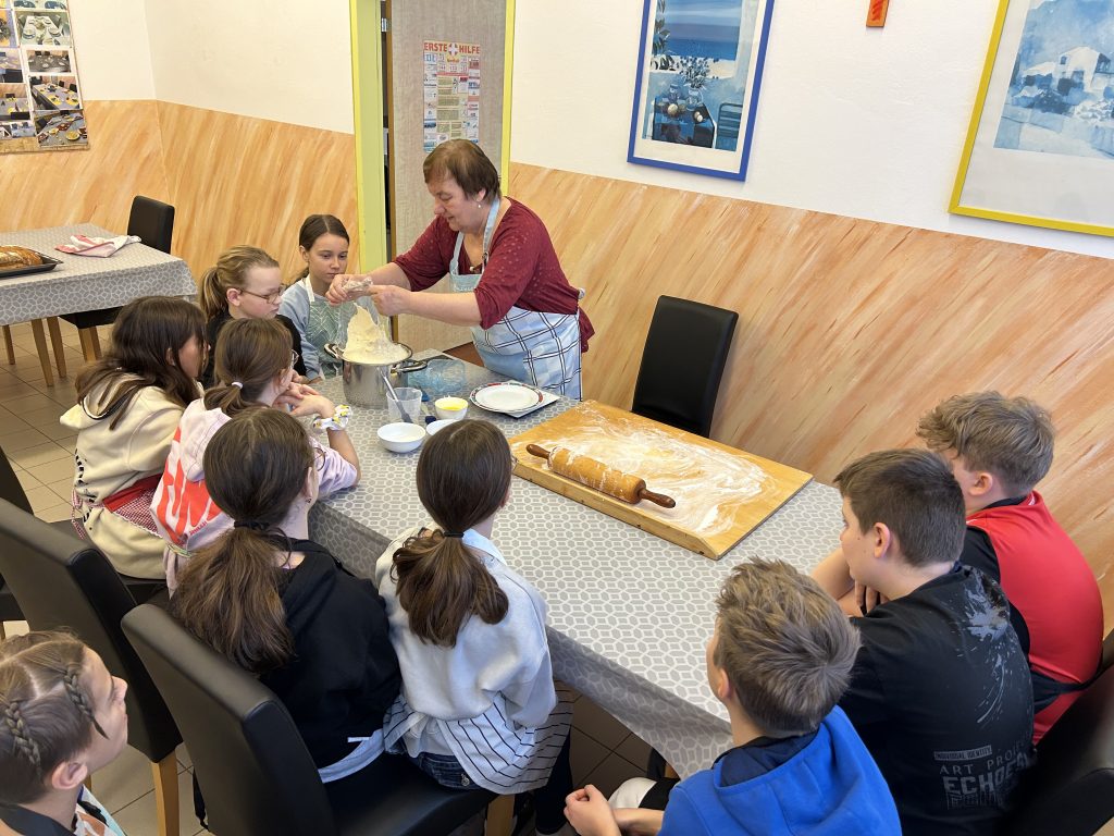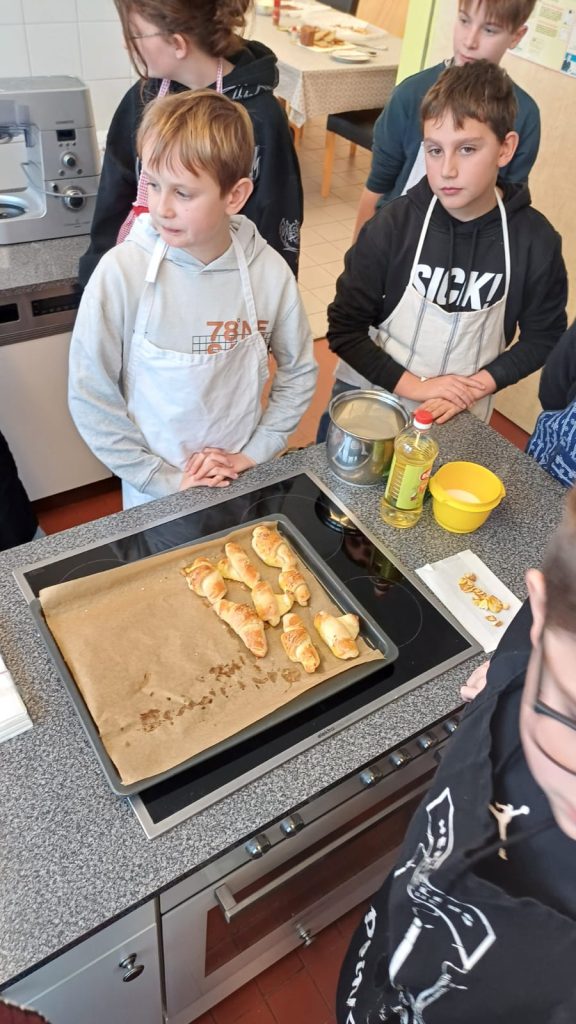Mit großer Begeisterung backten die 2. Klassen gemeinsam mit Helene Jautz und ihrem Mann frisches Brot und knusprige Salzstangerl. Dabei lernten die Kinder nicht nur die Zutaten kennen, sondern auch, wie aus Mehl, Wasser und Hefe mit Geduld und Teamarbeit köstliche Backwaren entstehen. Mit viel Freude wurde geknetet, geformt und natürlich auch gekostet. Der Duft von frisch Gebackenem erfüllte die Küche und machte das gemeinsame Backen zu einem besonderen Erlebnis für alle Beteiligten. Wir bedanken uns bei Frau Jautz und ihrem Gatten für dieses schöne Erlebnis!