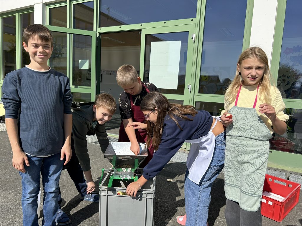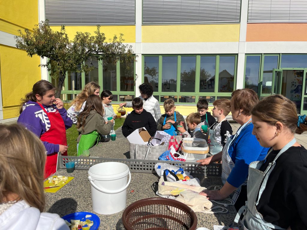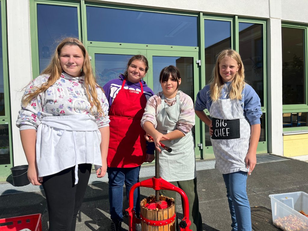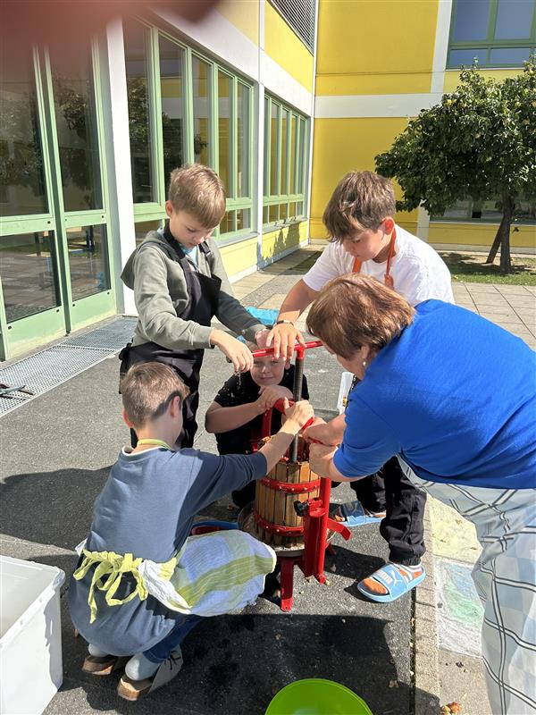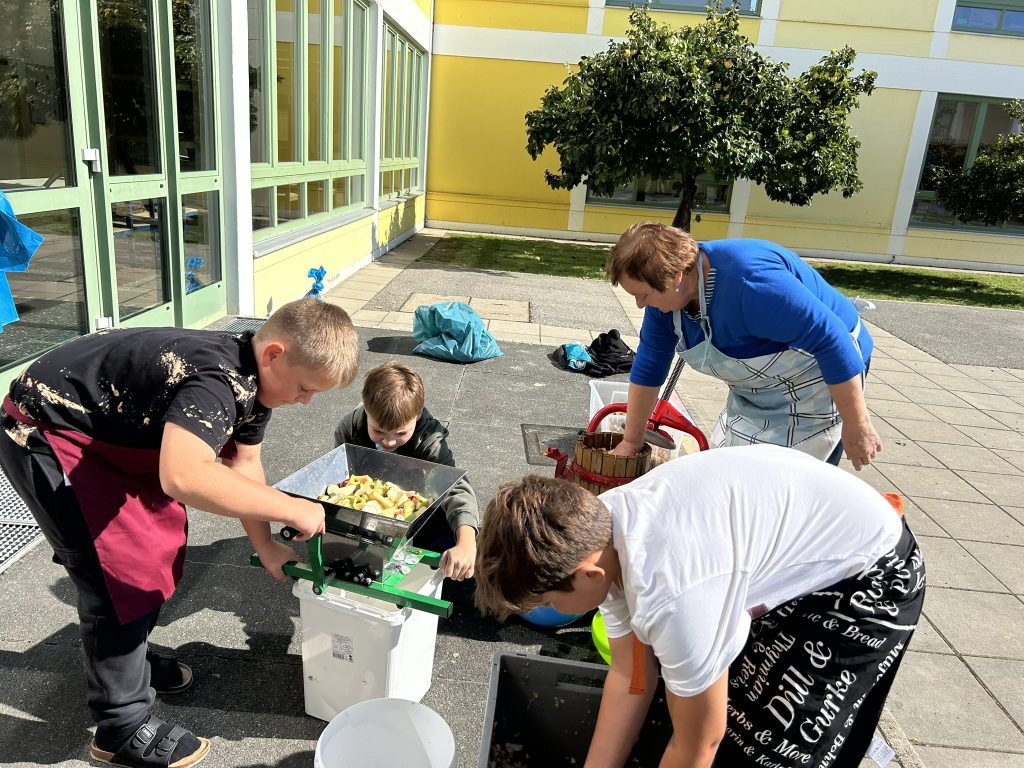 Unter der fachkundigen Anleitung unserer ÖKOLOG- und ÖNJ-Lehrerinnen sowie der pensionierten Apfelsaft-Expertin Frau Helene Jautz wurden die Äpfel gewaschen, geputzt und zerkleinert. Anschließend pressten die Schüler:innen ihre eigene Maische zu frischem Apfelsaft. Dabei lernten sie viel über Apfelsorten, die Technik des Pressens und nachhaltiges Handeln im Alltag.
