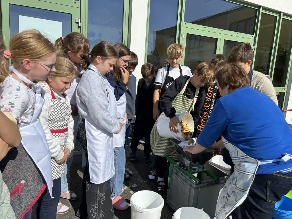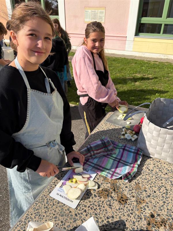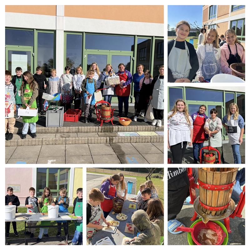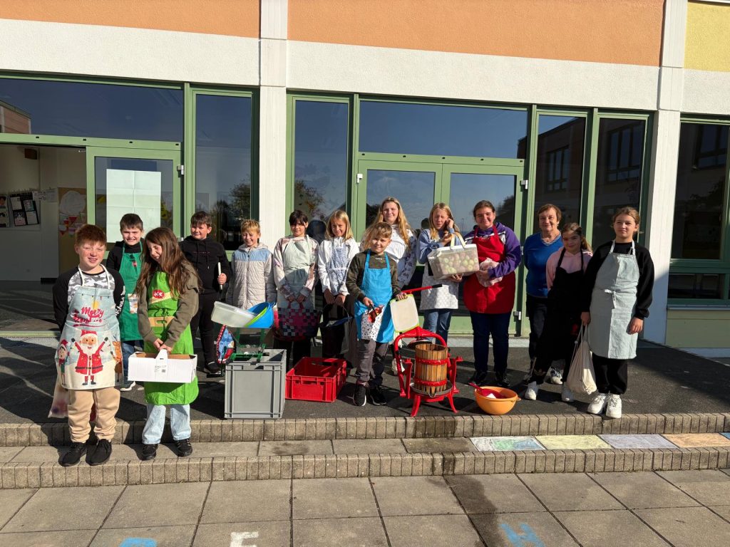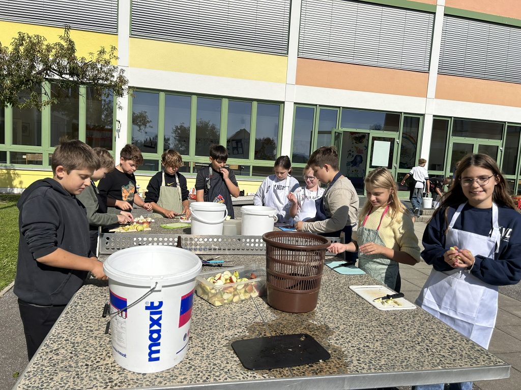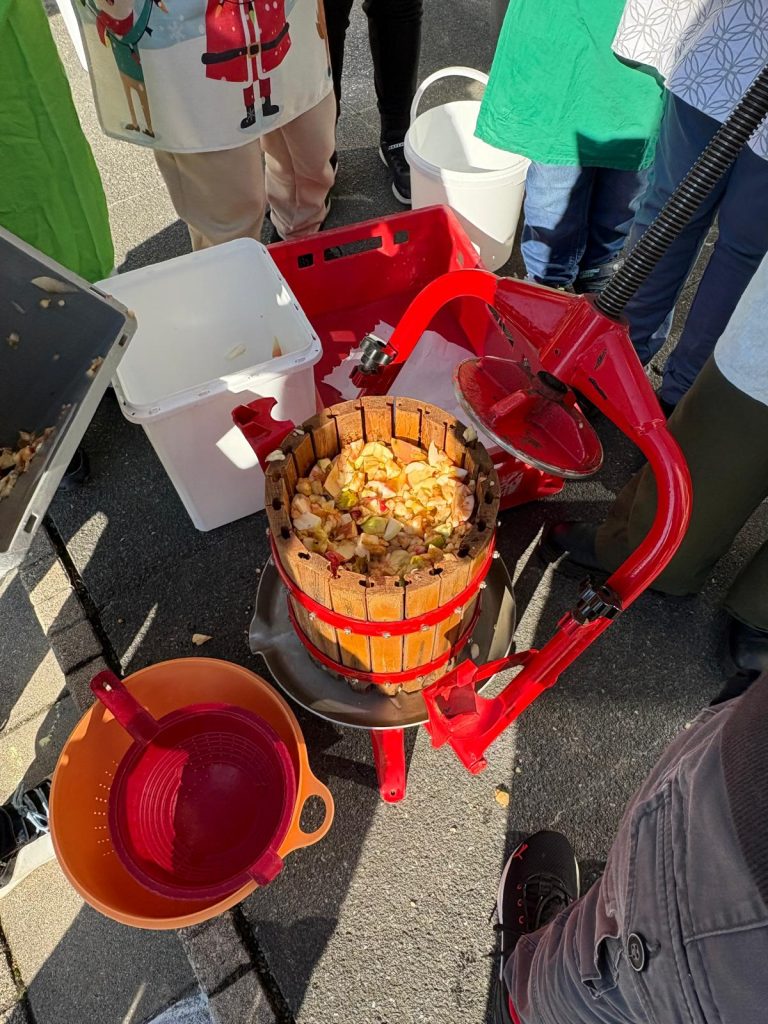Unter der fachkundigen Anleitung unserer ÖKOLOG- und ÖNJ-Lehrerinnen sowie der pensionierten Apfelsaft-Expertin Frau Helene Jautz wurden die Äpfel gewaschen, geputzt und zerkleinert. Anschließend pressten die Schüler:innen ihre eigene Maische zu frischem Apfelsaft. Dabei lernten sie viel über Apfelsorten, die Technik des Pressens und nachhaltiges Handeln im Alltag.