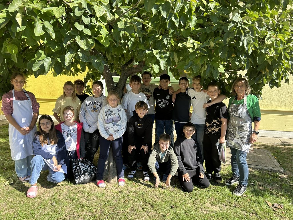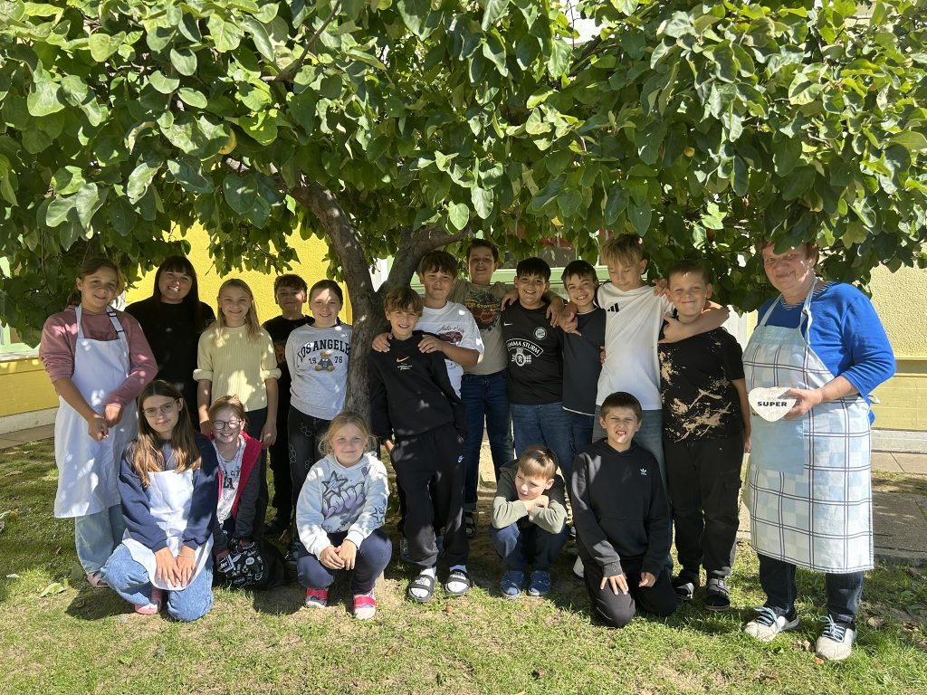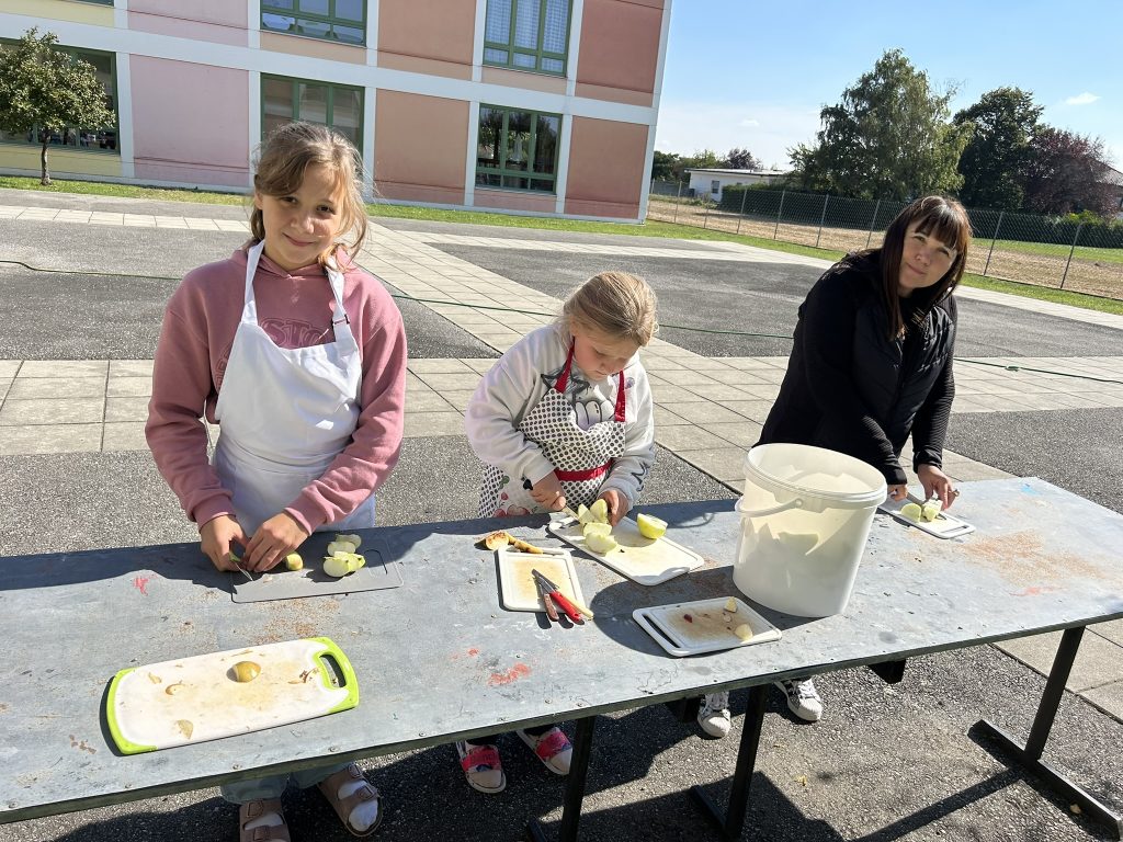 Početkom oktobra pretvorila su dica 1. razredov friške, nešpricane jabuke iz domaćih vrtov u ukusan sok. Pod stručnim peljanjem učiteljic za ekolog i umirovljene učiteljice i stručnjakinje za prešanje jabuk, gospe Helene Jautz, naučila su dica mnogo o vrsti jabuk, o tehniki prešanja i održivom ponašanju. Kad su kušali sok, bilo je svim jasno: Samoprešani friški domaći sok ima bolji ukus nego paketirani koncentrirani sok od jabuk!