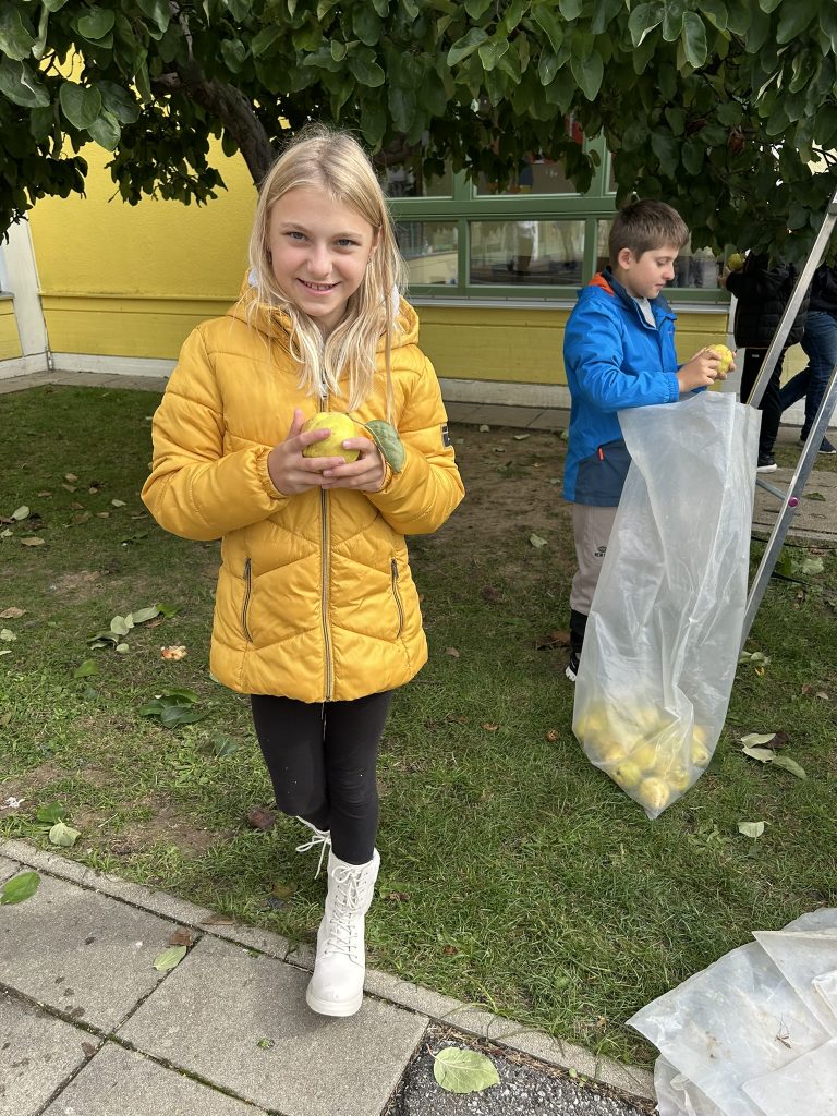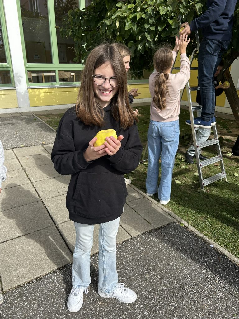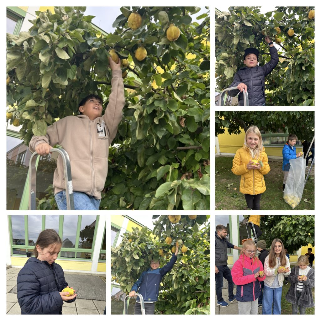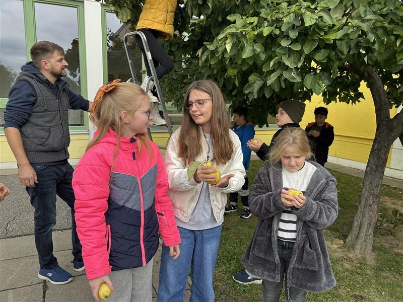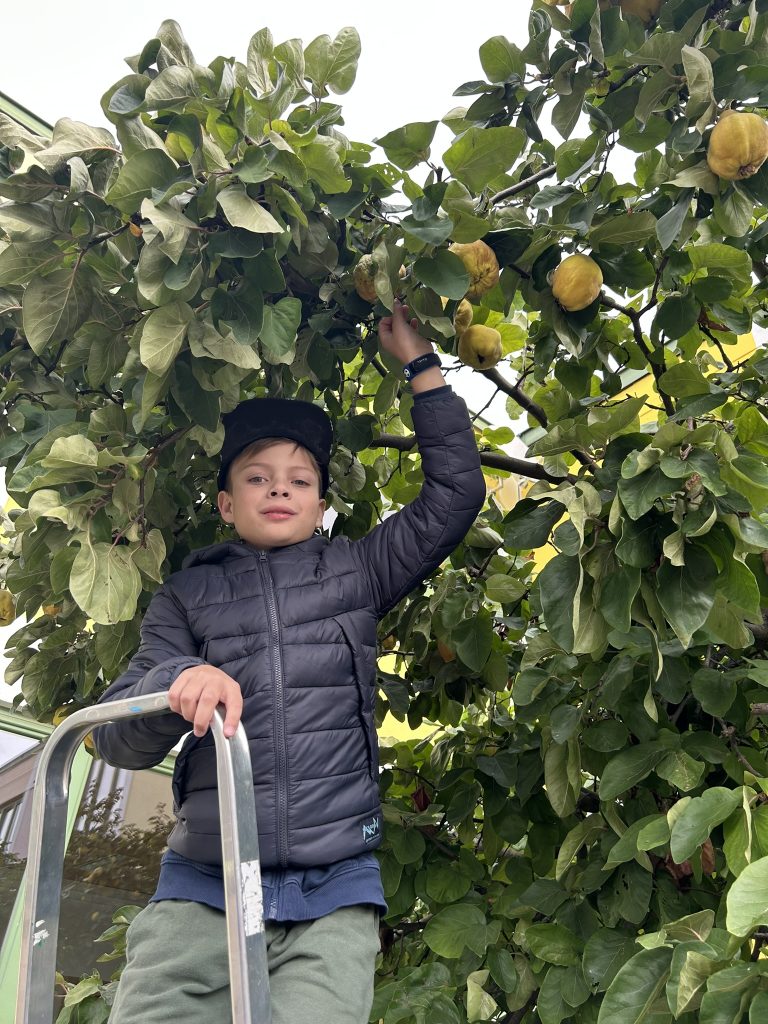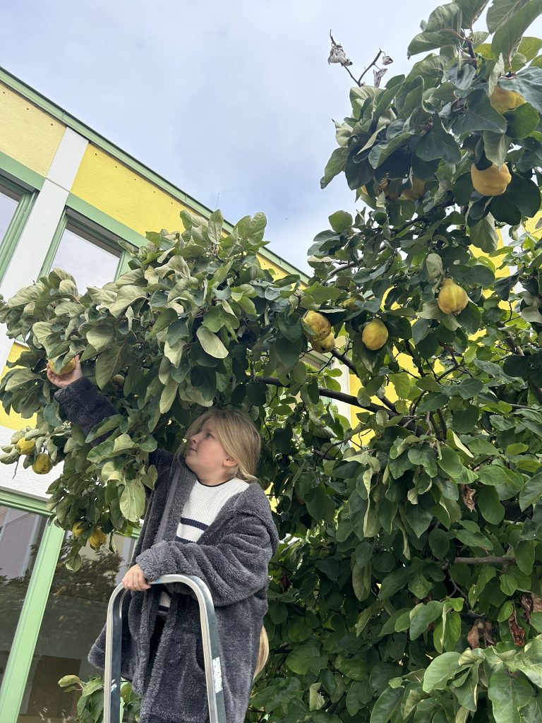 Anfang Oktober durften die Klassen 1k und 2a gemeinsam mit ihren Lehrern die leuchtend gelben Quitten pflücken. Begeistert und geschickt kletterten die Kinder auf die Leiter, ernteten das Obst behutsam und lernten mit viel Eifer und Teamgeist, wie man die Früchte richtig behandelt. Dabei sammelten sie zahlreiche Ideen, was man Leckeres daraus zubereiten kann.